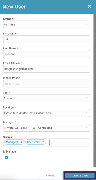 - In the user creation window, select an active status (Full Time, Part Time, or Contracted), then complete the required fields such as name, address, job and location.