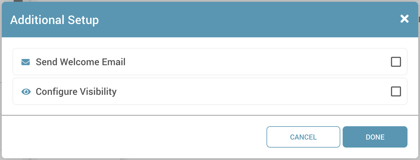 - Note: If you skipped the Additional Setup window or closed it by mistake, you can always complete these steps later by clicking the Three Dots Menu on the user's profile and selecting Actions > Send Welcome Email to invite them or Configure > Visibility to adjust their settings.