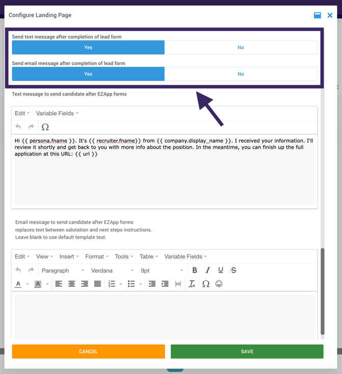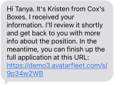 Personalize the automated messages your candidates receive immediately after applying via your Landing Page to improve engagement and application completion rates.
