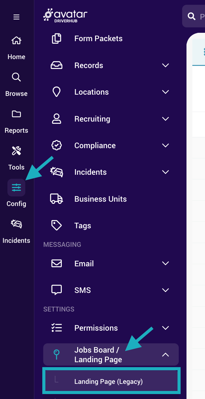- Navigate to Config > Jobs Board/Landing Page > Landing Page. This will open a configuration window containing various settings.