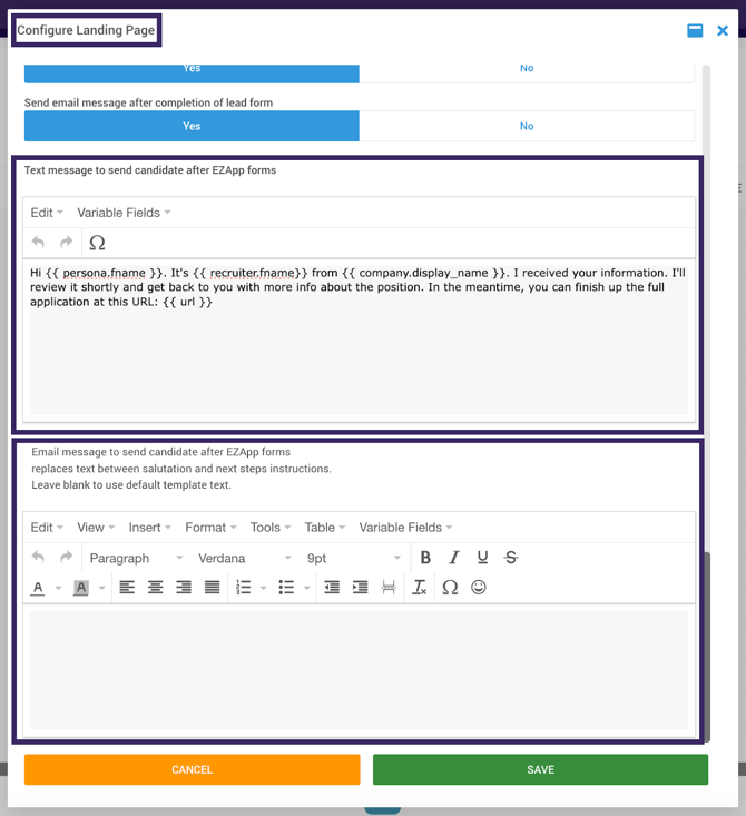 Tip: Use Variable Fields in both areas to automatically pull in the candidate's name or specific job/company details.