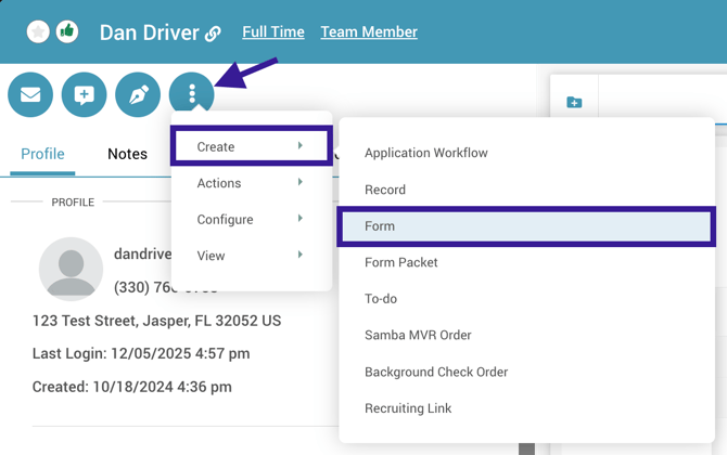 - Once inside the driver's profile, locate the three dots menu located immediately underneath the driver's name. Click this icon and select Create > Form.