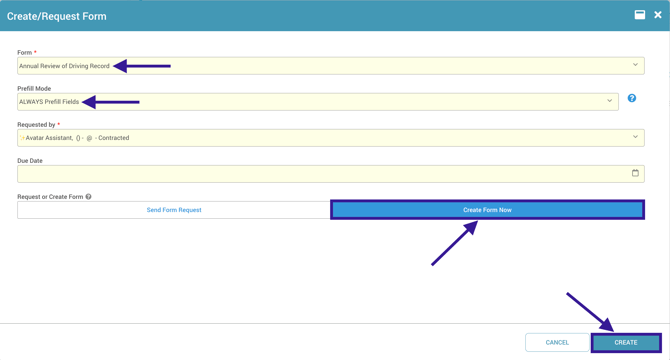 - Toggle Request or Create Form to Create Form Now, then click Create on the bottom right. This will open the form so that you can complete it right from the driver's profile.