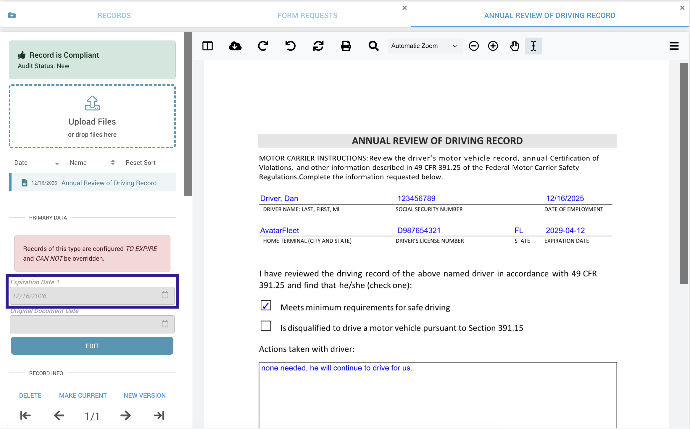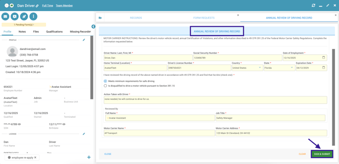 - Once submitted, the Annual Review of Driving Record is saved immediately to the driver's profile as a signed PDF, which automatically expires a year after the form was completed.