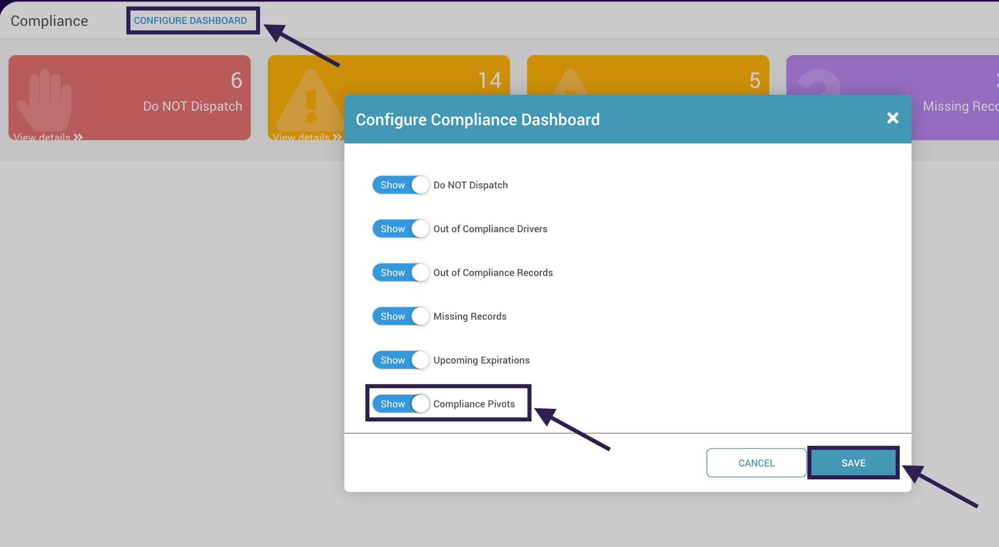 - At the top left of the Compliance Dashboard, click on Configure Dashboard. This will open a series of toggles that let you determine what shows up on your dashboard. Toggle Compliance Pivots to ON, then click Save.