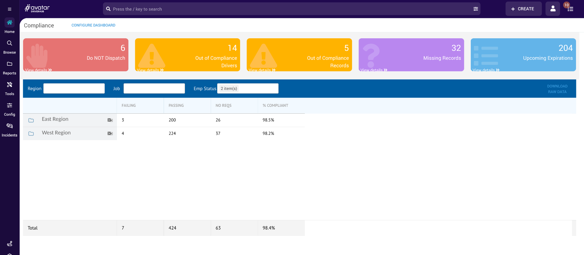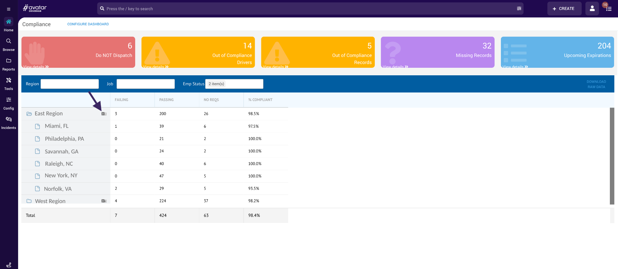 - View by Region: The top-level view displays compliance data grouped by Region.
