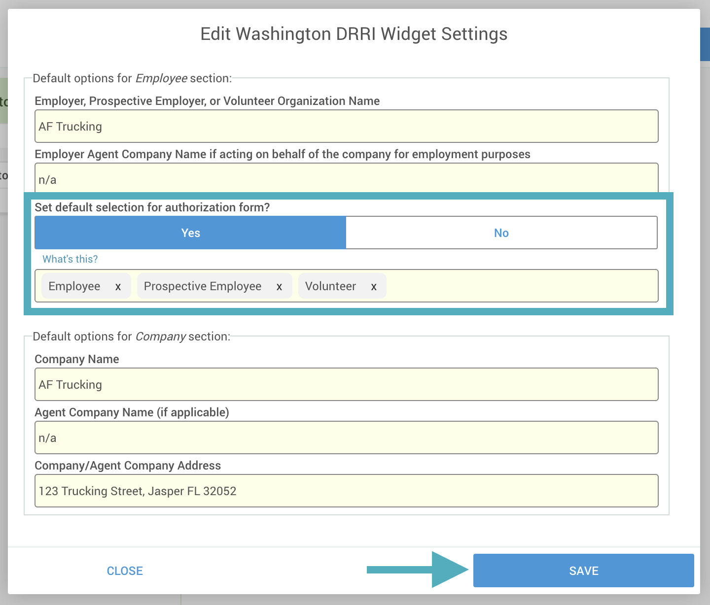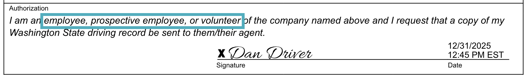If your employees are required to sign a Washington DRRI as a part of their application, you can configure the DRRI widget to automatically populate the user's role in the authorization section of the form. This way, the question will not be visible to the applicant.