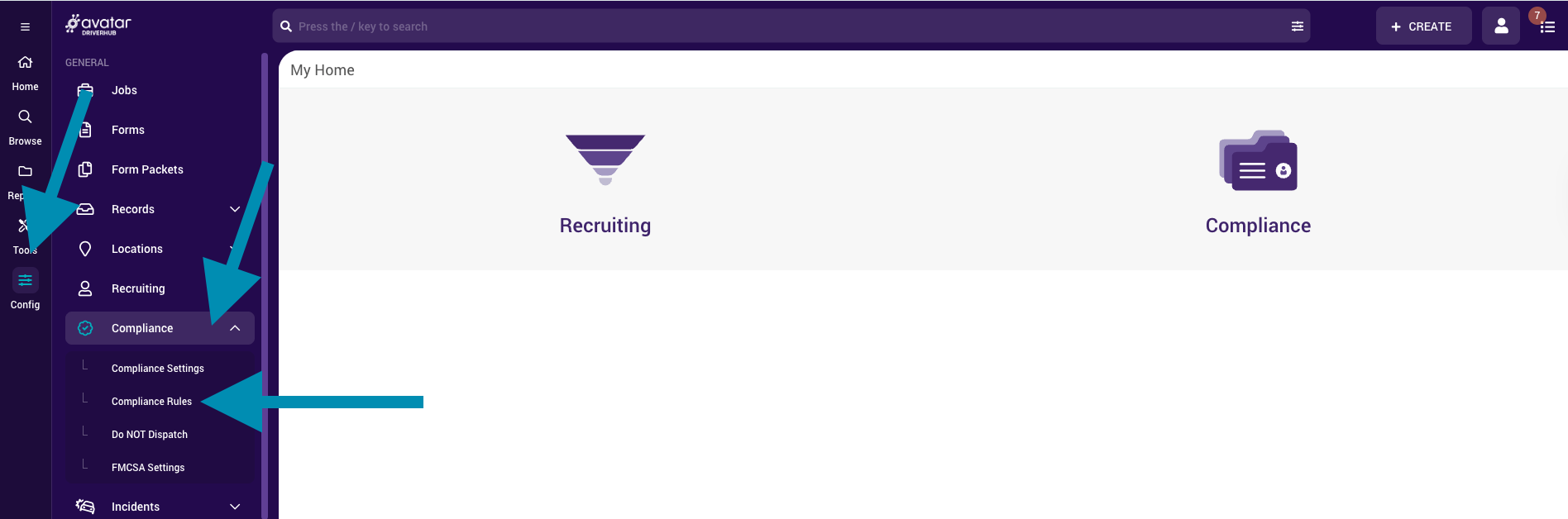 Compliance Rules determine which record types are required for each job position in DriverHub. These rules drive compliance tracking and determine which team members appear in categories such as Out of Compliance Records, Out of Compliance Drivers, Missing Records, or Do Not Dispatch.