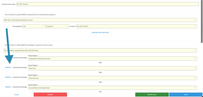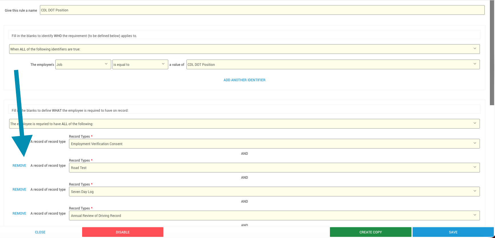 To remove a record type from compliance tracking, remove it from the list of required records for the position by clicking Remove to the left of the record type.