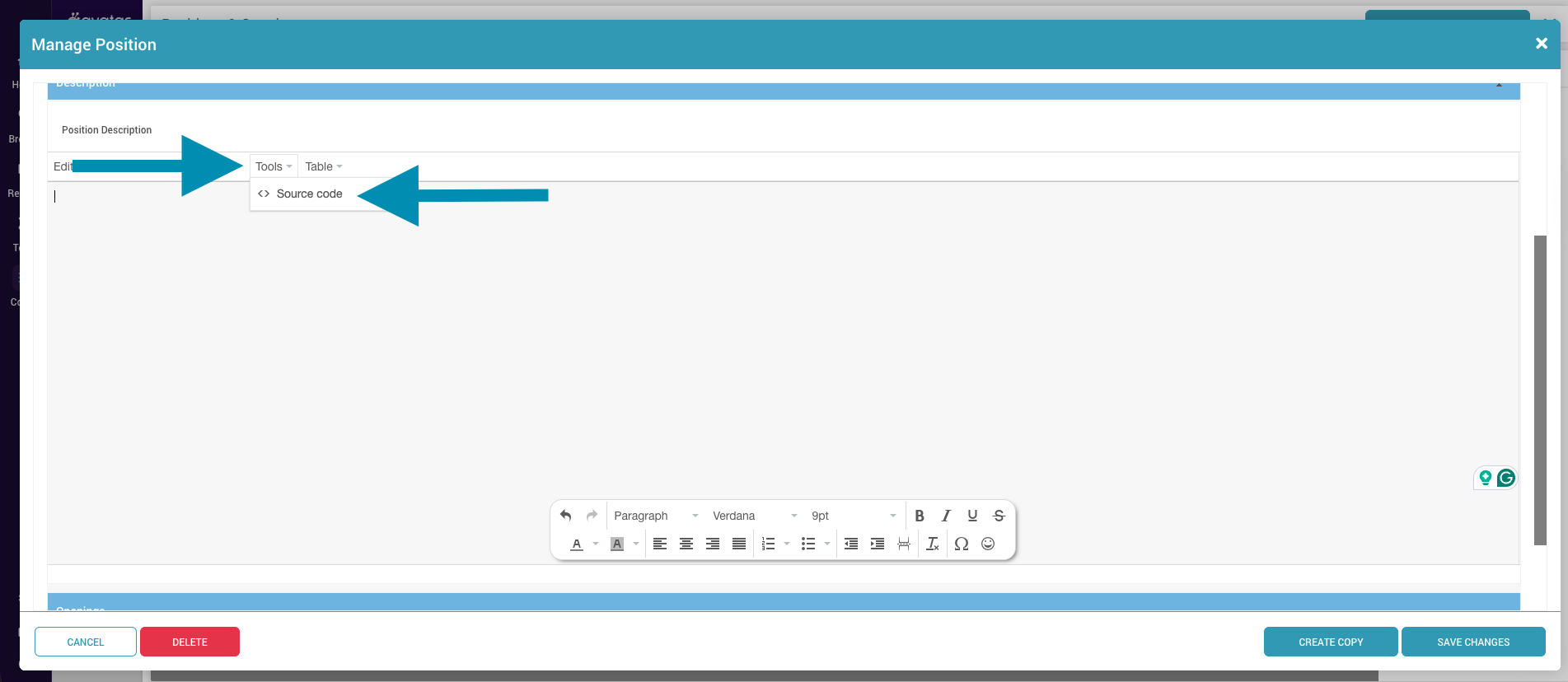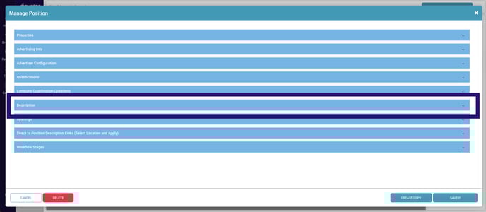 In DriverHub, open the Description text field for your position or opening. Click config on the left hand menu, click Recruiting, then click Positionings and Openings. Select a postiong to edit and scroll down to the Descriptions text field. You may need to click on it to expand the settings.