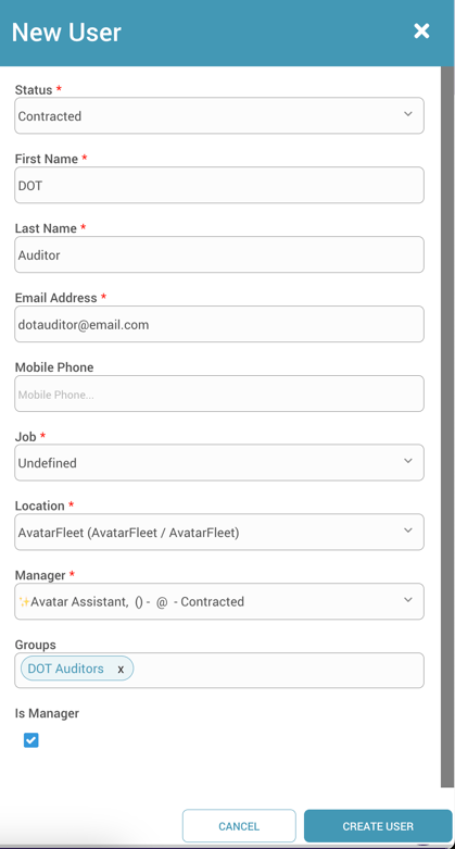 - Click Create > User at the top right of DriverHub and fill in the following fields: