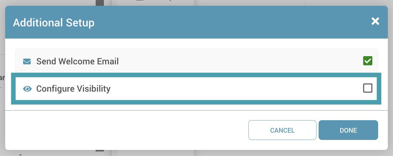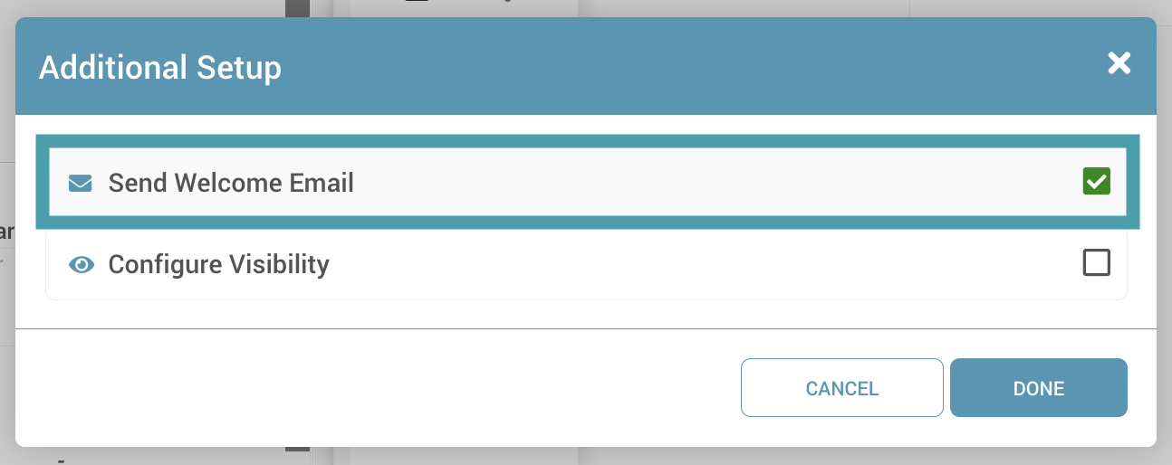 Upon profile creation, you will see a small window with options to Send a Welcome email and Configure Visibility.