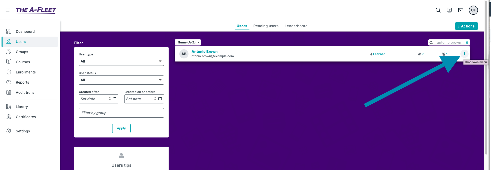 You may need to delete users from your Training Marketplace portal from time to time. Deleting a user permanently removes them from your portal and reduces your total user count. Simply disabling a login does not reduce your user count, so deleting is the correct option when someone has left your company.
