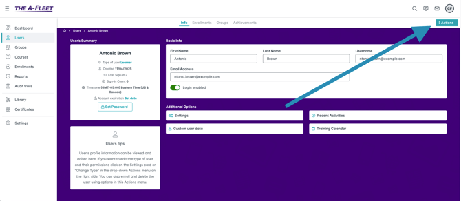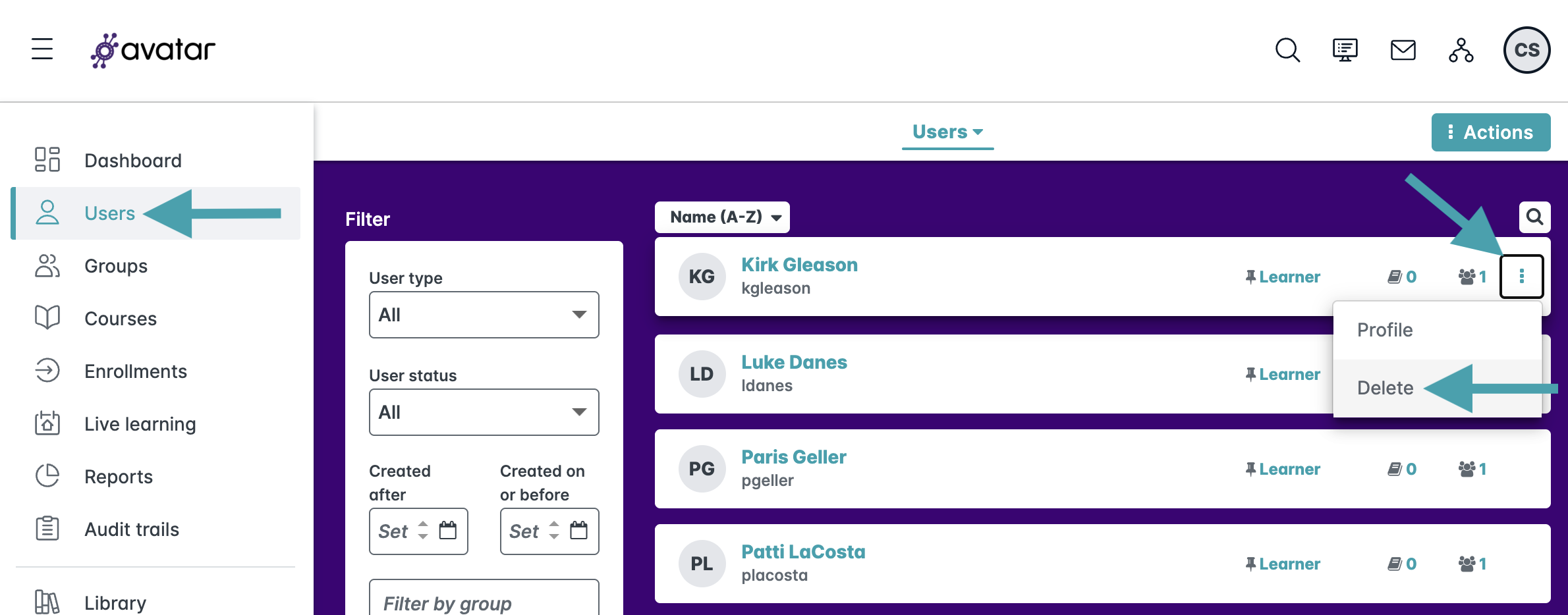 You may need to delete users from your Training Marketplace portal from time to time. Deleting a user permanently removes them from your portal and reduces your total user count. Simply disabling a login does not reduce your user count, so deleting is the correct option when someone has left your company.