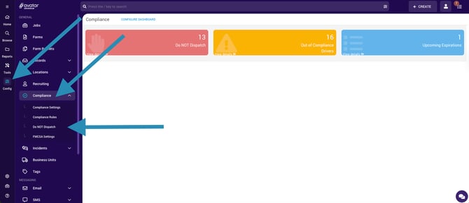 The DriverHub Compliance Dashboard provides a quick snapshot of your key compliance metrics. It contains tiles you can click on to quickly see details on upcoming record expirations, out-of-compliance drivers, and individual missing or out-of-compliance records. There is also a tile called "Do NOT Dispatch". This article will show you how to configure that to best manage your drivers and your fleet. ![]()