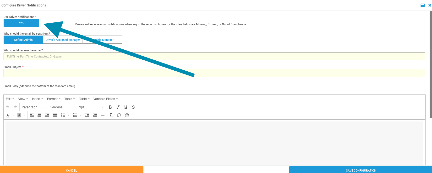 At the top of the page, select Yes under Use Driver Notifications.![]()