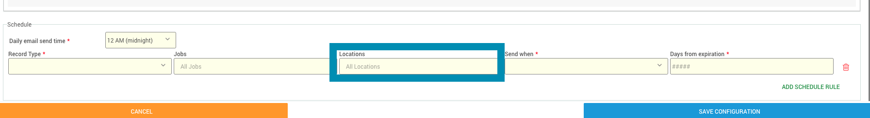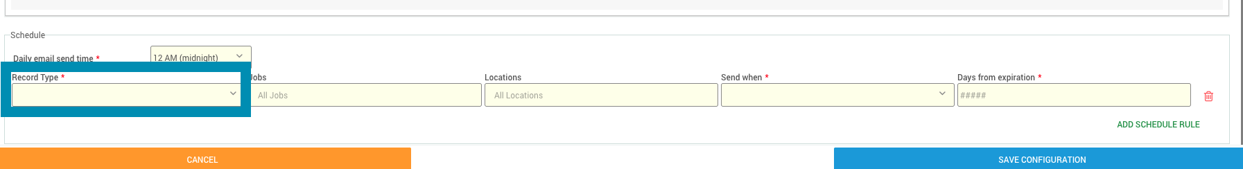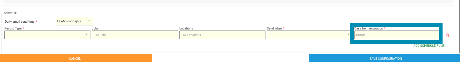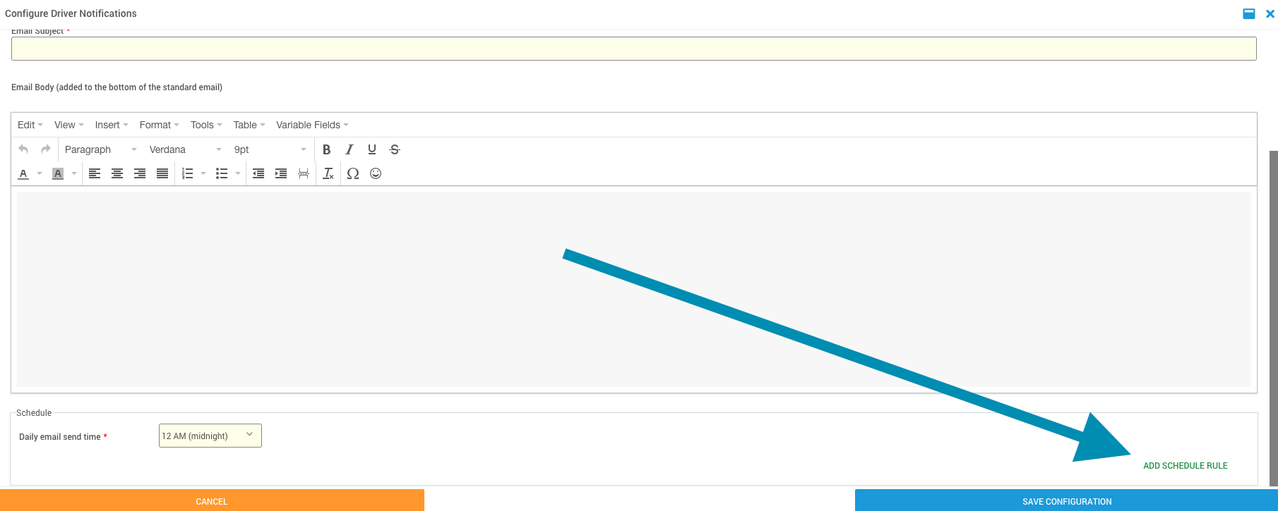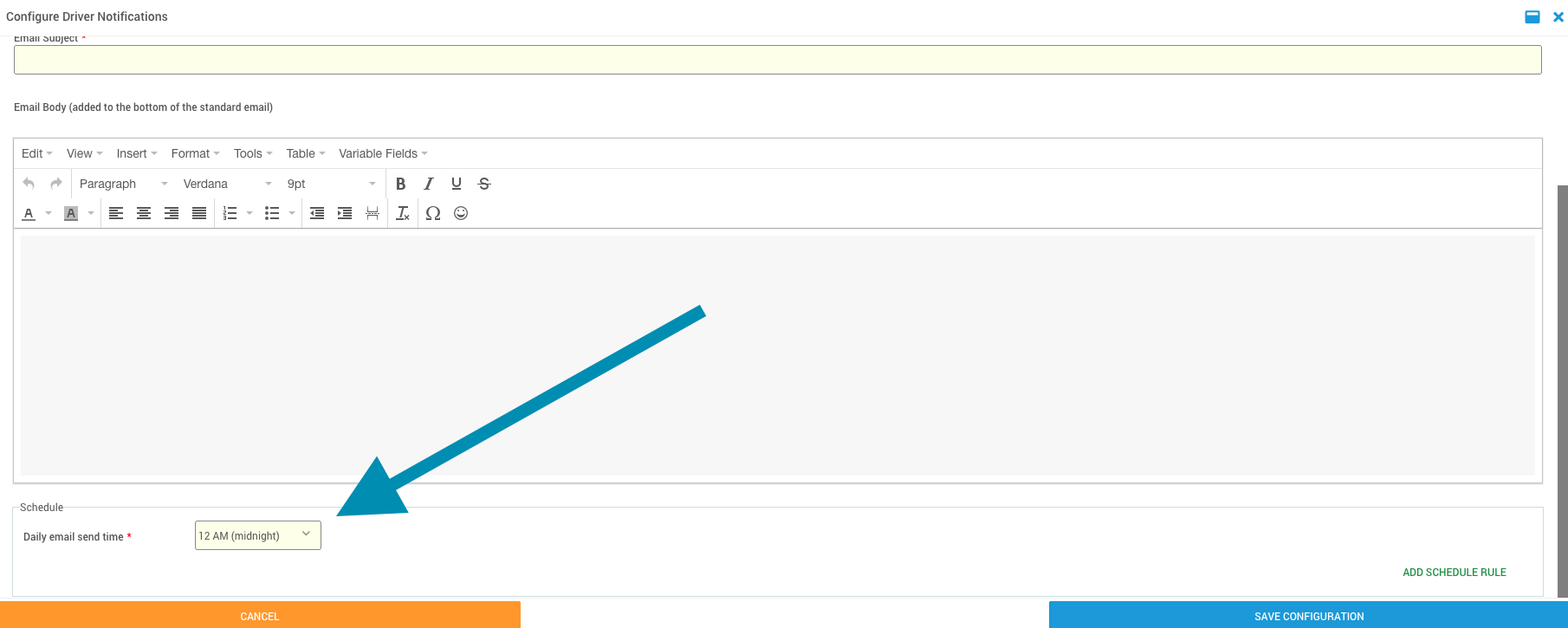 Scroll to the Schedule section and select a Daily email send time. This determines when DriverHub sends notifications unless you add a custom schedule rule.![]()
