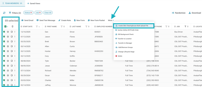- Click on More from the Mass Actions menu that appears, then click Create D&A Clearinghouse Bulk Upload File.