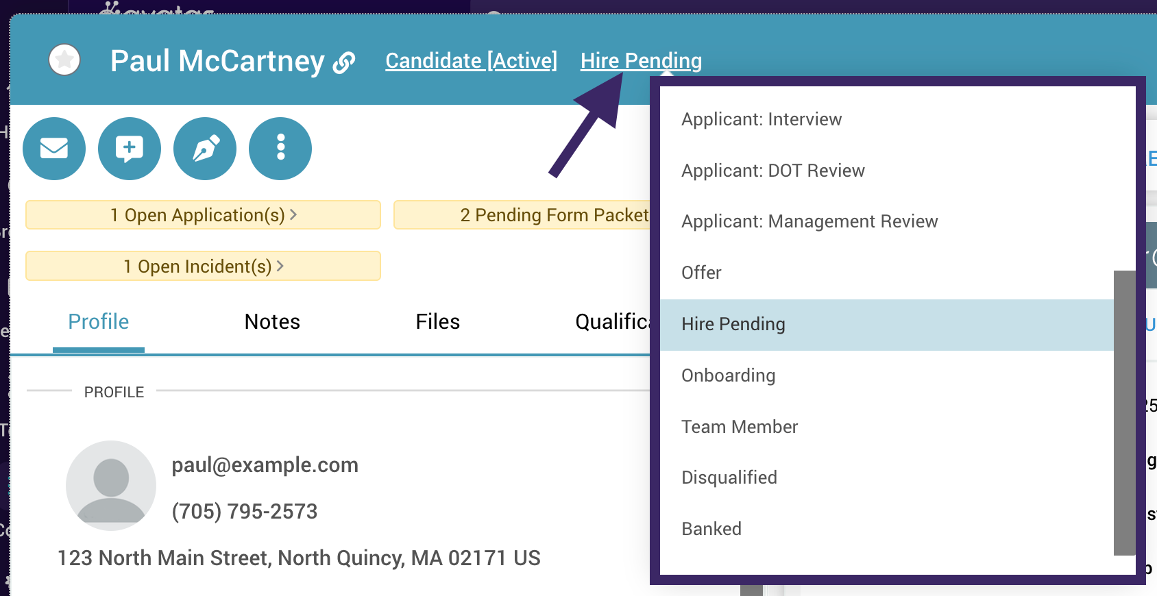 Move candidates through your pipeline by updating their individual profiles.