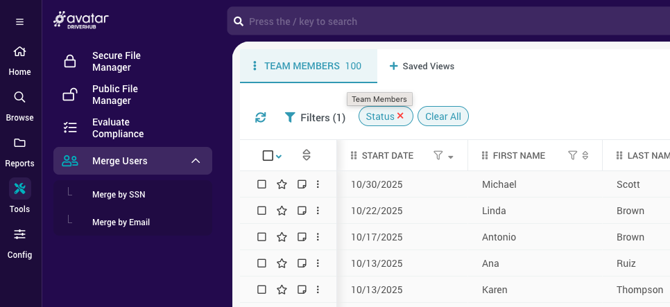 If two profiles exist in your DriverHub system for the same person, you can merge them into a single user profile. You can merge profiles from the user’s profile or through the side navigation menu.