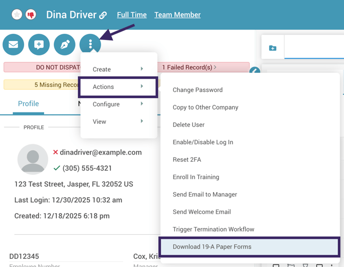 - On a driver's profile, click the Three Dots Menu > Actions > Download 19-A Paper Forms.