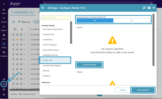 - Toggle Operates Busses in the State of New York to Yes. This will activate the enhanced 19-A form functionality, create record types with each of the available NYS forms, and allow you to add your carrier and vehicle information.