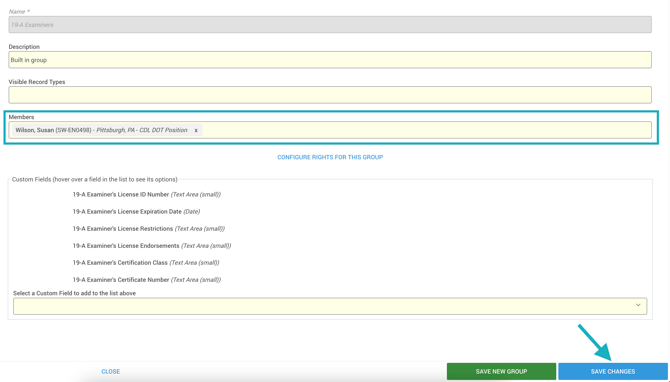 - Navigate to Config > Permissions > Groups to assign users to the 19-A Examiners group. Simply click on the group and add users to the Members field. Users in this group will automatically have custom fields added to their profiles that must be completed in order for examiner fields to pre-fill in applicable forms.