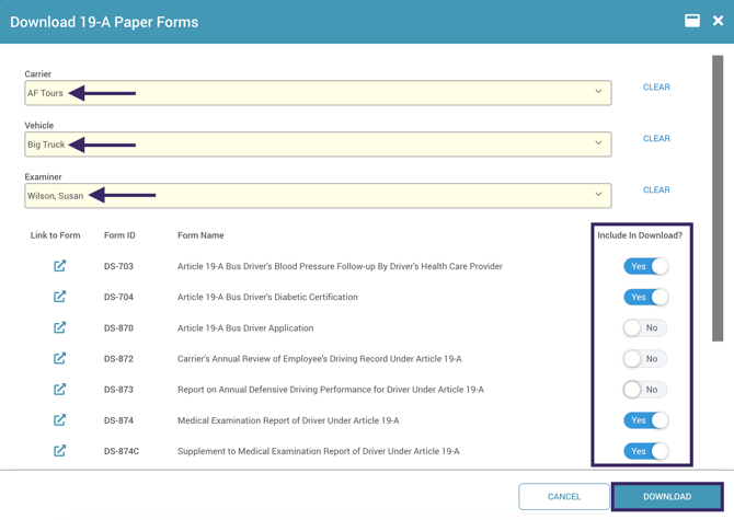 - Select your desired carrier, vehicle, and examiner if applicable, choose the relevant 19-A forms, and click Download.