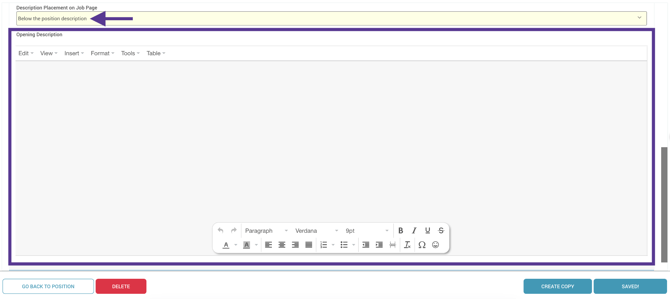 - Description (optional but recommended): Use this section to create a position description for the position. This description will apply to all openings unless otherwise specified within an opening's configuration.