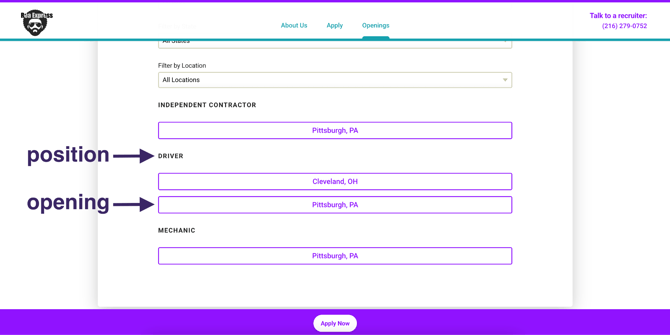 - Opening: A specific instance of a Position tied to a specific Location (e.g., "Long Haul Driver - Dallas, TX").