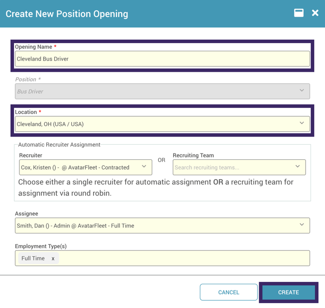 - Type in an Opening Name, select a Location, and optionally edit the Recruiter/Recruiting Team, Assignee, and Employment Type if you’d like any of those to be different from the Position defaults.