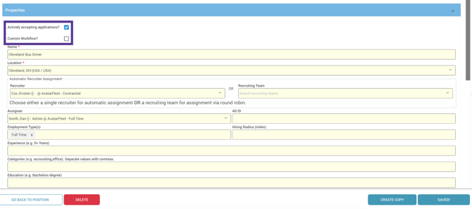 - Properties: In this section, you can edit the initial details and configure whether or not this position appears on the company’s job board (Landing Page) and if you want to use Indeed Apply.