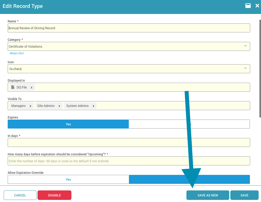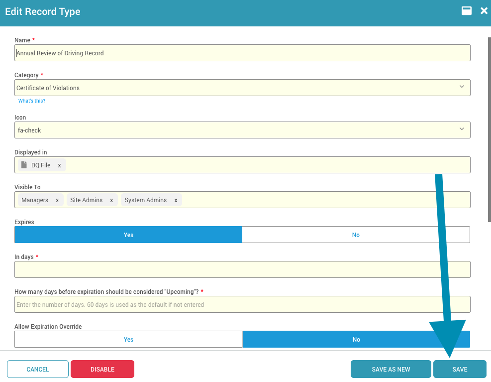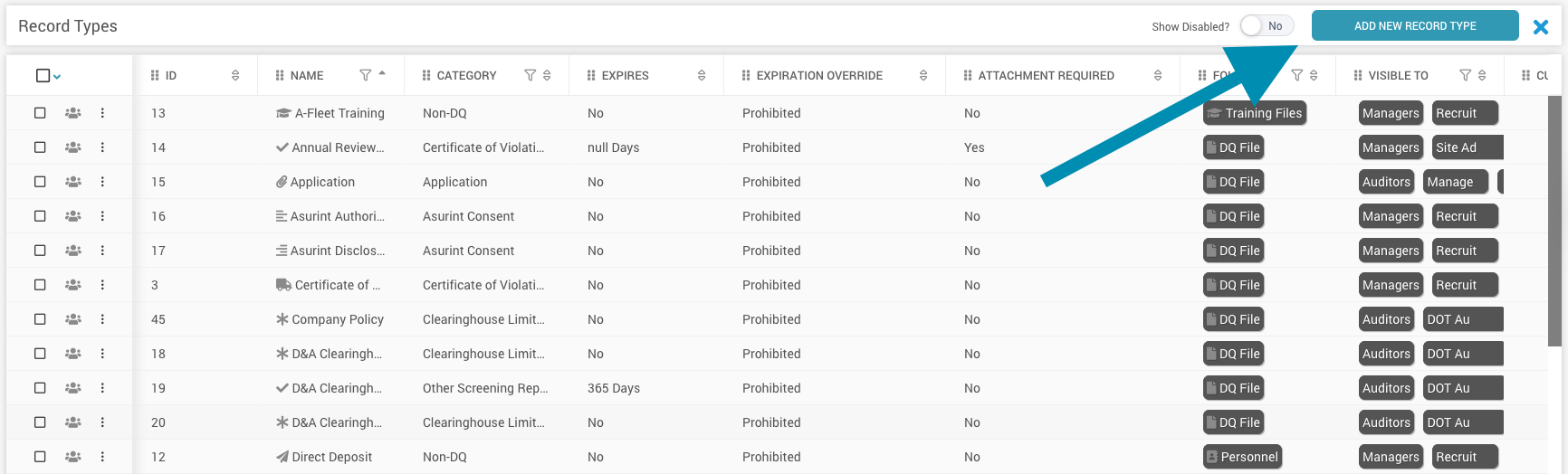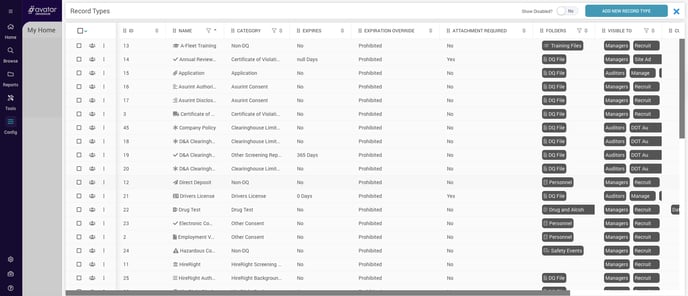 Record Types classify records so DriverHub can interpret them, apply compliance rules, and determine which user groups can view them. Consistent names and icons also prevent confusion from inconsistent file names.