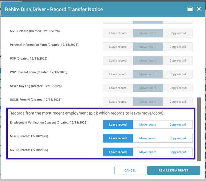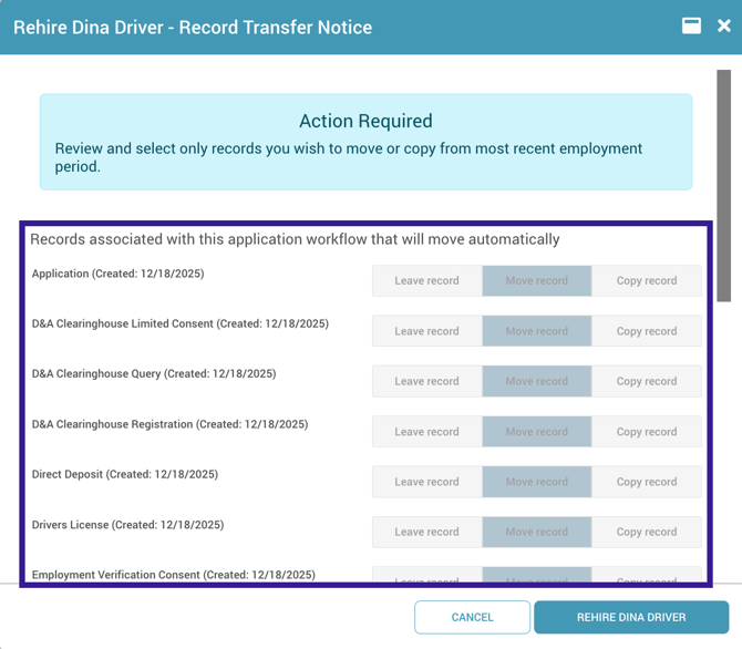 The Rehire feature streamlines the return of former employees, ensuring their compliance history is preserved while keeping their current employment file clean and organized. By strategically copying or moving records, you can save your team time during the onboarding process.