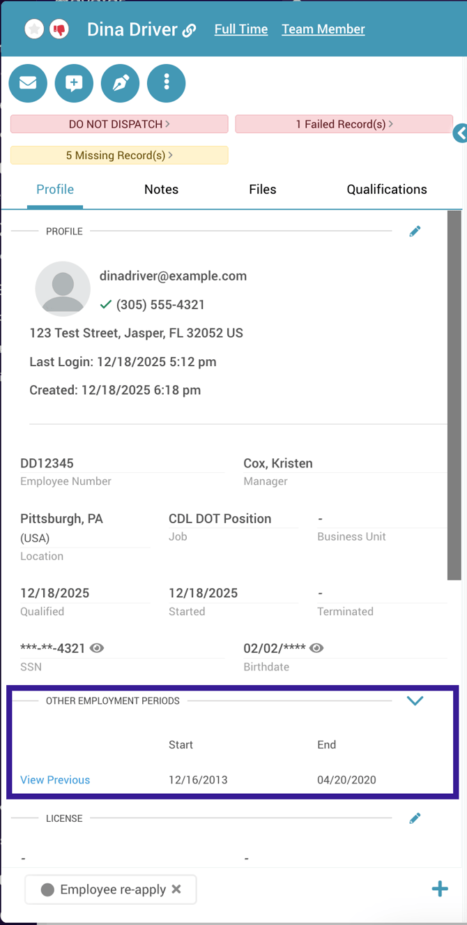 - Search Functionality: When using the search bar, the system will populate the driver's current active profile. You can always access historical files from within that profile via the Other Employment Periods section.