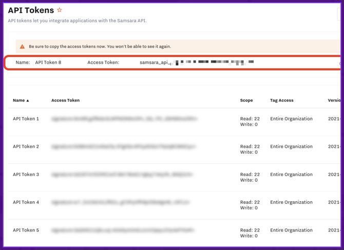 You can manage API Tokens for secure access to the API on Samsara's API Tokens settings page.