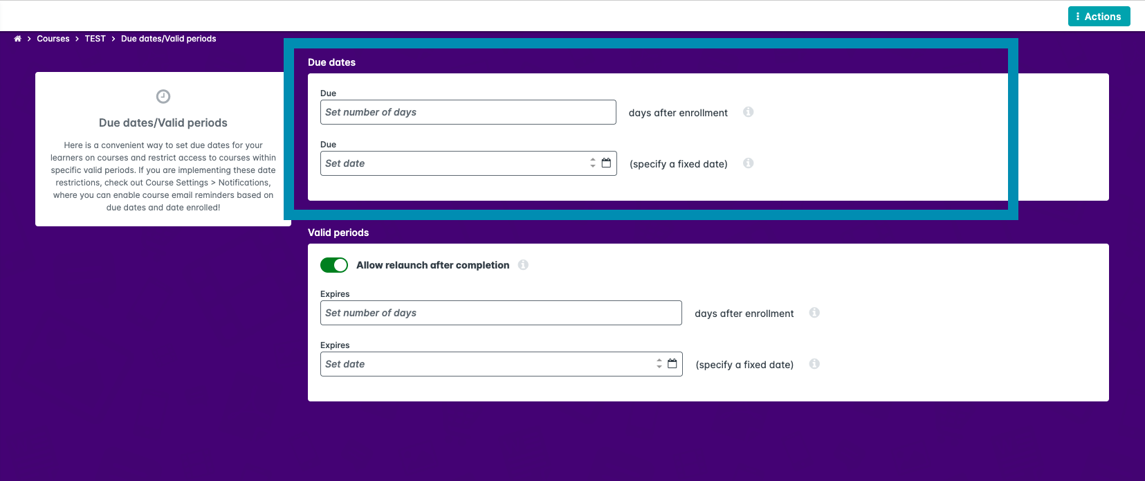 Training Marketplace allows administrators to control how long a learner has to complete a course. You can set a due date, a valid period, or both. These settings let you enforce deadlines such as 30 days after enrollment or a fixed calendar date.
