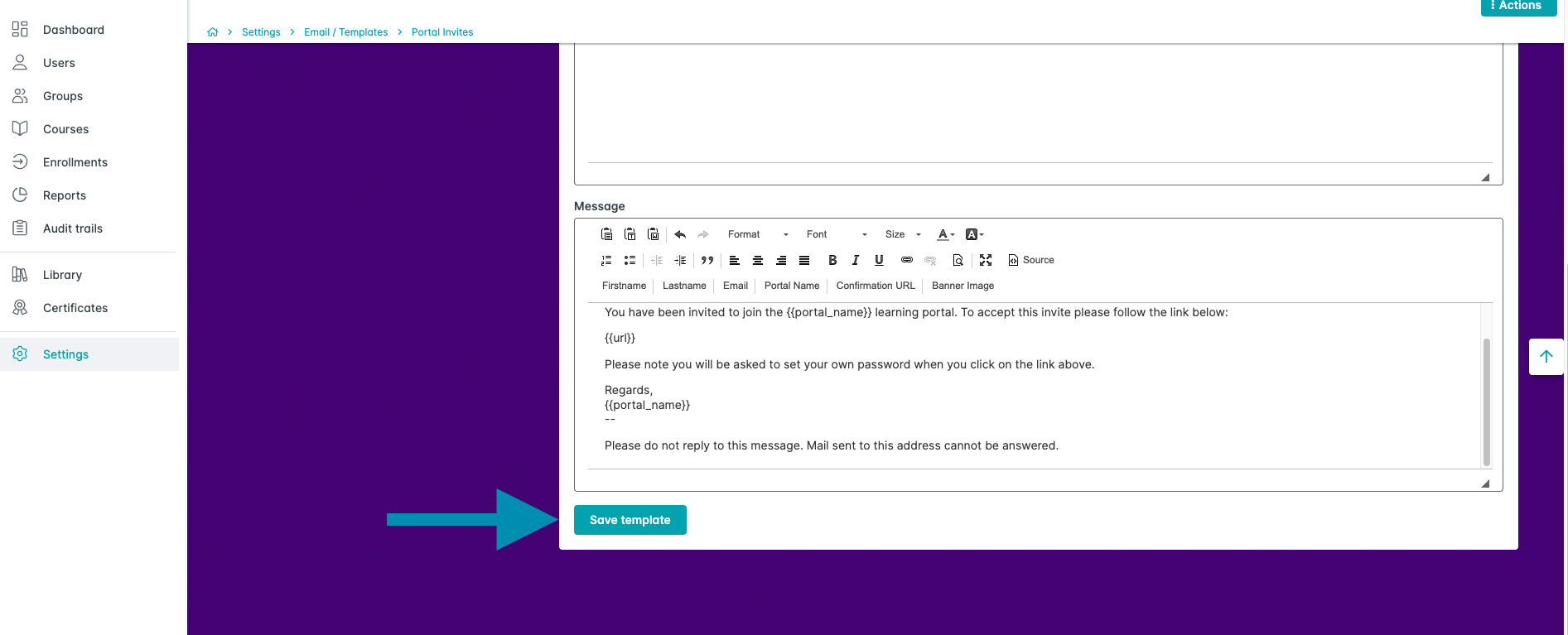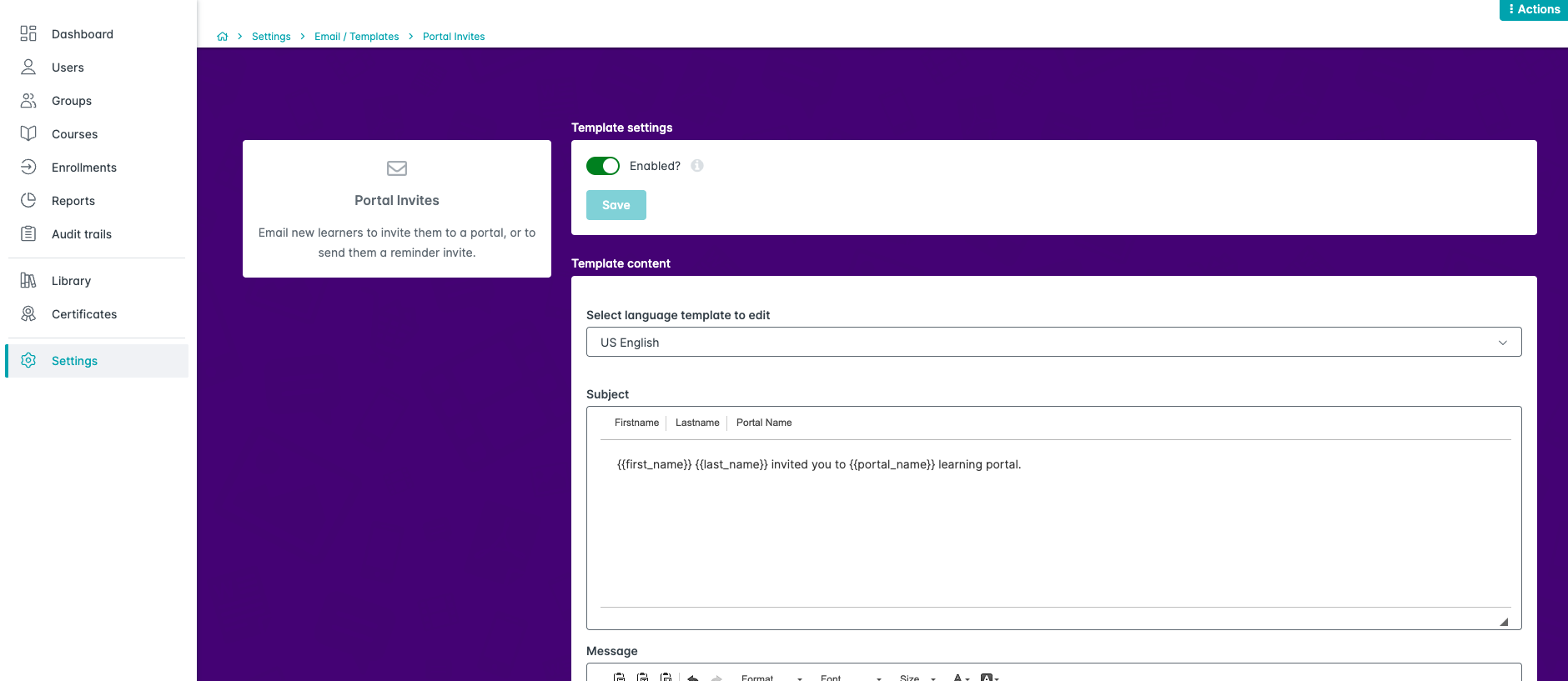 Edit the message if needed. Do not change or delete the variable fields because they populate the user’s name and the invite link.