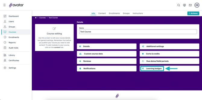 - Click Courses on the main navigation menu, select the course you want to edit, then click on Learning Badges. This option will not appear in Course setting unless gamification is enabled.