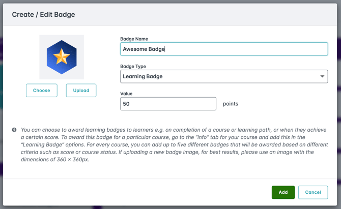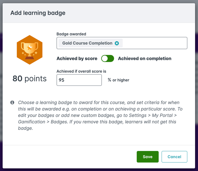 - If you click on Add Learning Badge, a pop-up will appear where you can select a badge, select if you want that badge achieved by completion of the course or by a certain score, then Save.
