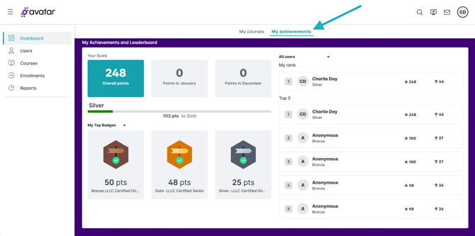 Each learner can also view the Leaderboard and their own achievements by choosing the My Achievements option on the top of their dashboard.![]()