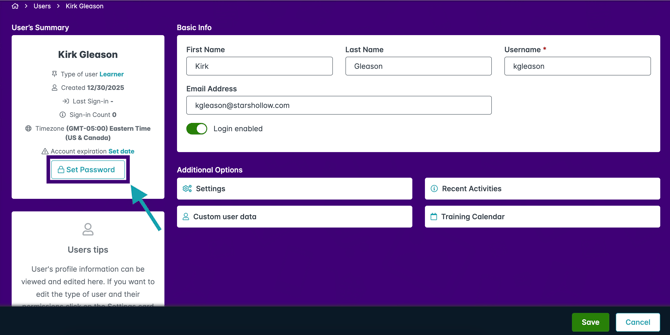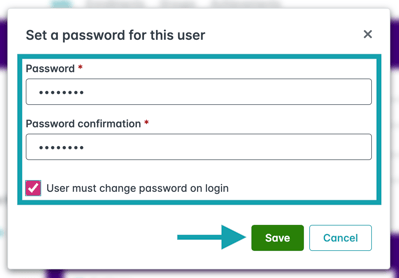 - Set a new password for the user, and check the box for User must change password on login so the learner can choose their own password next time they log in. Click Save.