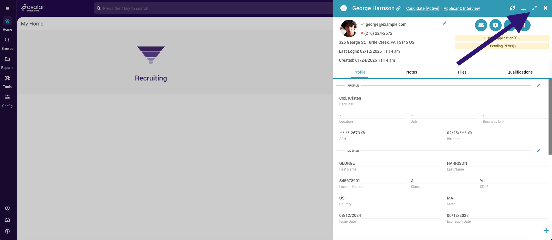 In DriverHub, you can access a candidate’s full application directly from their workflow. Start from the candidate, switch from Peek View to the full profile if needed, then open the application to review the complete submission.